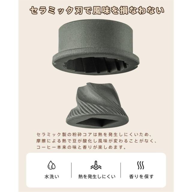 セラミック製の粉砕コアは熱を発生しにくいため、摩擦による熱で豆が酸化し風味が変わることがなく、コーヒー本来の味と香りが楽しめます。
