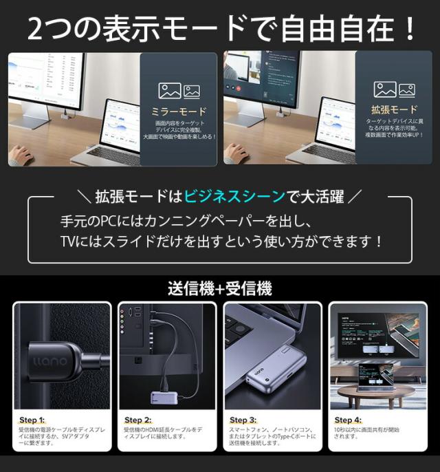 設置不要 即ミラーリング ワイヤレスHDMI 送受信機 セット Ilano LLANO-S850|無線 HDMI アダプター 送信機 受信機 スマホ テレビ PC 接続 ミラーリング 高画質 プレゼン 会議 映画 ゲーム iPhone Android Type-C給電 【送料無料(宅配便)】