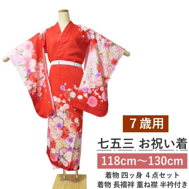 七五三 七歳 女の子 着物 四つ身 セット No.002 赤 絵羽柄 正絹(着物+長襦袢)7才 祝い着 身長118cm〜130cm対応
