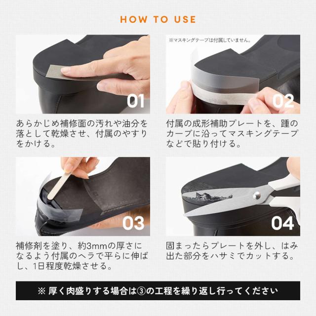 ●補修に必要なやすり・成形補助プレート・ヘラ付きで、買ってすぐに補修できて、お気に入りの靴が長持ちします。