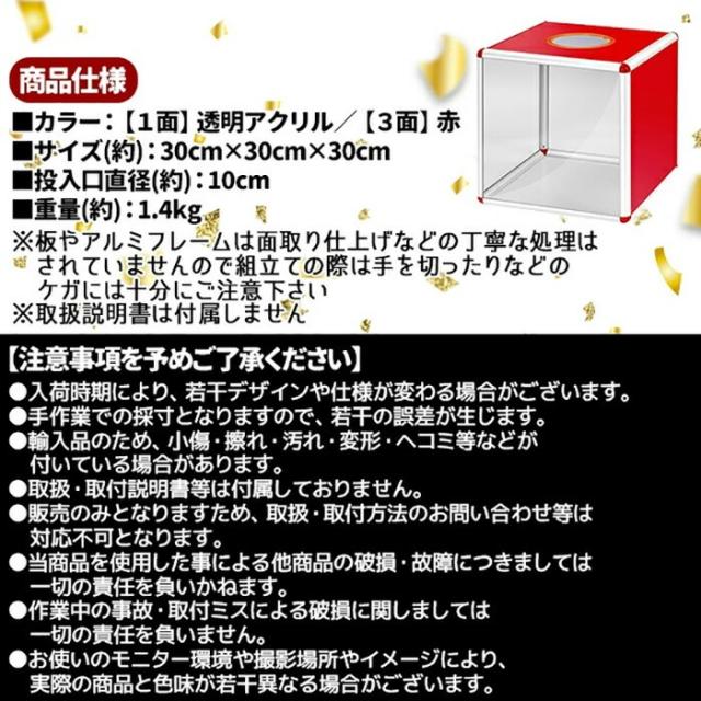 抽選箱 1面クリア 抽選ボックス 投票箱 30×30×30cm アクリル抽選箱 透明 イベントグッズ 組み立て式 パーティー 新年会 二次会 くじ引き ビンゴ大会 抽選会 ボックス ビンゴ くじ 景品 イベント