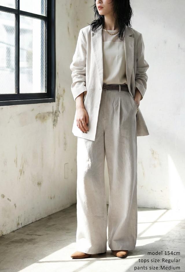 テーラードジャケット×シアートップス×タックパンツの3点コーデセット。