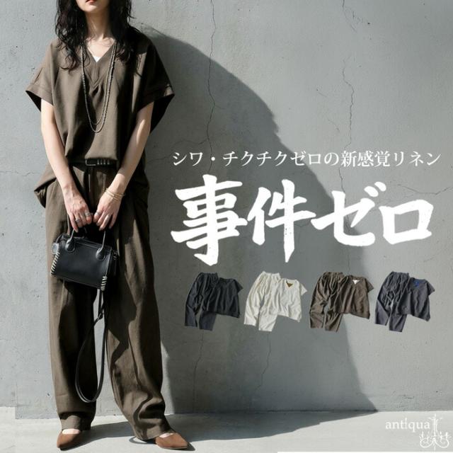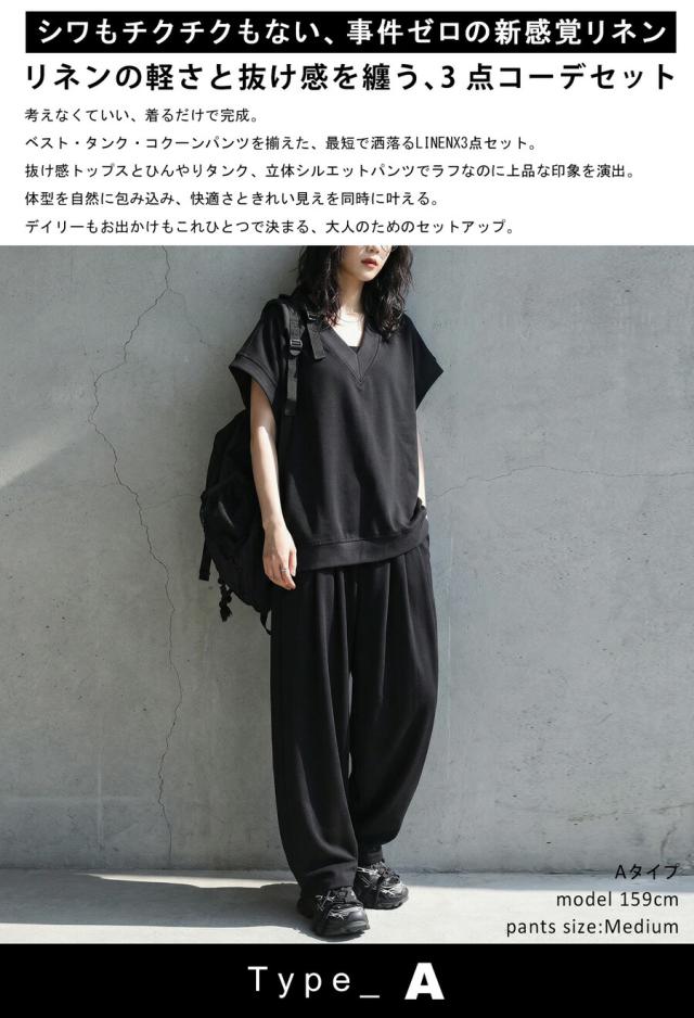 code-00055 リネン風 コーデ セット 3点セット プルオーバー Vネック タンクトップ 冷感 コクーンパンツ ウエストゴム タック ゆったり 体型カバー リラックス イージー モード