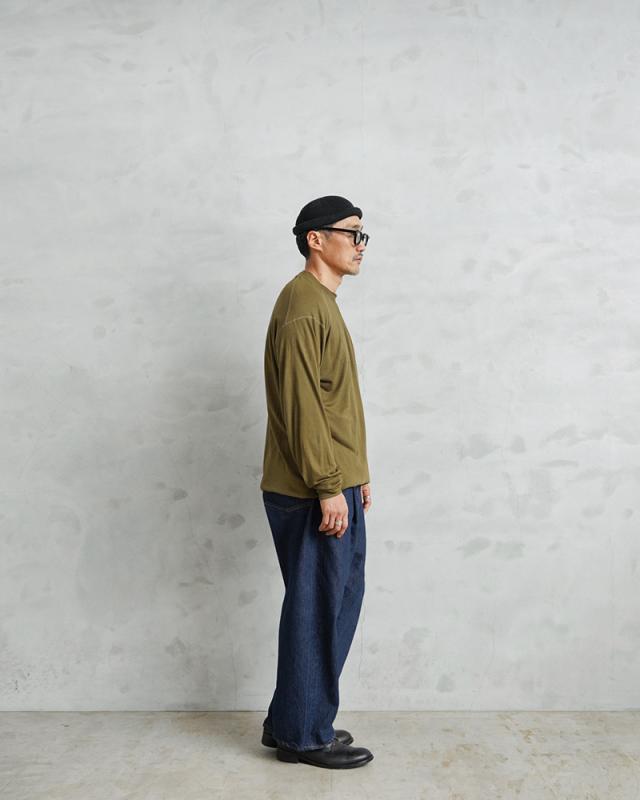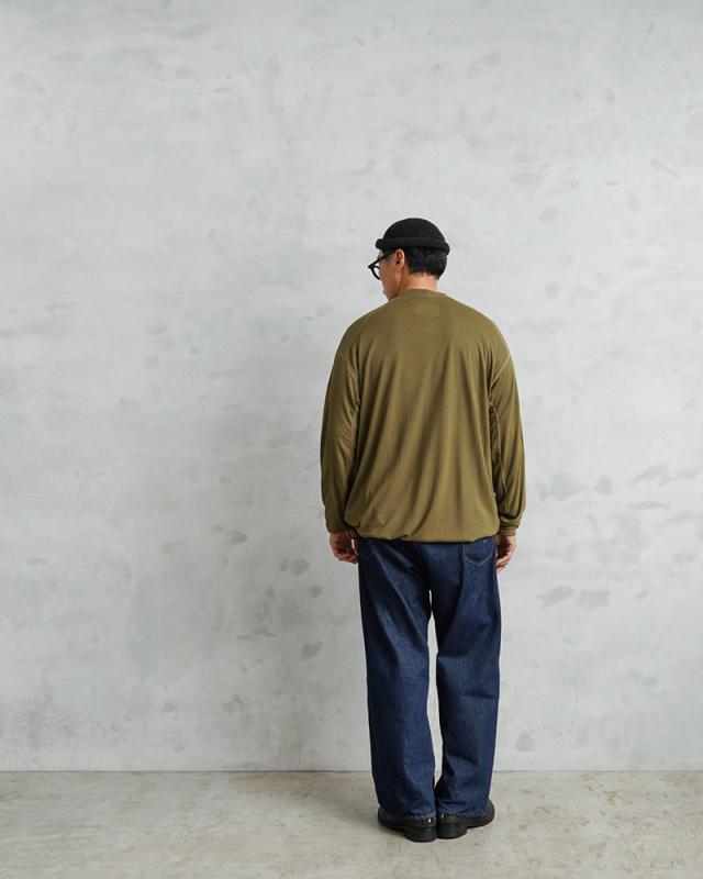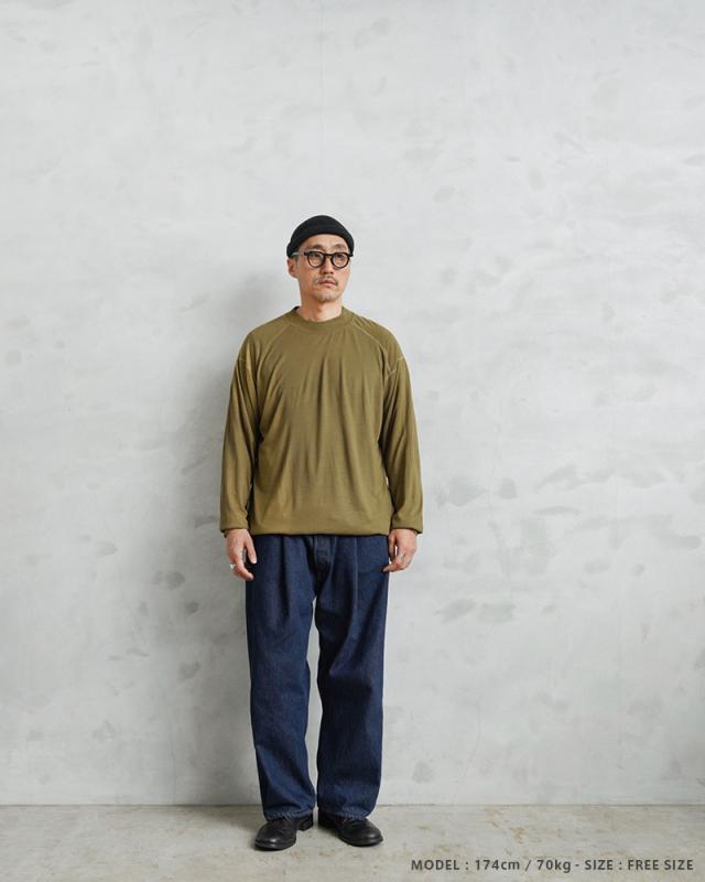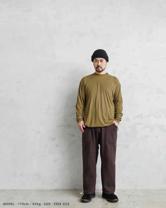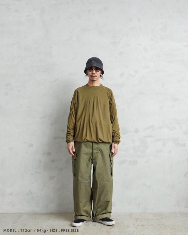 米軍のカットソーアイテムを多く手掛ける、PECKHAM社製のモックネック(XLサイズ)のロングスリーブシャツの裾部分にドローコードを追加したリメイクをWAIPER.incで制作しました!アメリカ軍海兵隊(US MARINE CORPS)で着用されていたベースレイヤーで、薄手のしっとりとした生地はで吸汗性、透湿性、抗菌性、速乾性に優れた心地よい着心地。裾にラバープリントされている「FROG」の文字と、マリンコープスのロゴに蛙のモチーフのデザインは「FLAME RESISTANT ORGANIZATIONAL GEAR」の略称で文字通り、難燃性の素材を使用したアイテム群で構成されたUSMCのプロダクトを指します。少し幅広めのモックネック部分にはリブ襟を採用することによってフィット感を高めています。