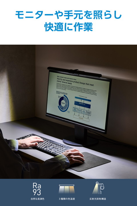 暗い部屋でも快適に作業できる!モニターに引っ掛けるだけで、手元を明るく照らすLEDモニターライトです。モニターへの反射を抑え、光が直接目に入りにくい設計で目の負担を軽減。高演色の自然な明かりで、明るさ10段階・色温度6段階の調節が可能です。