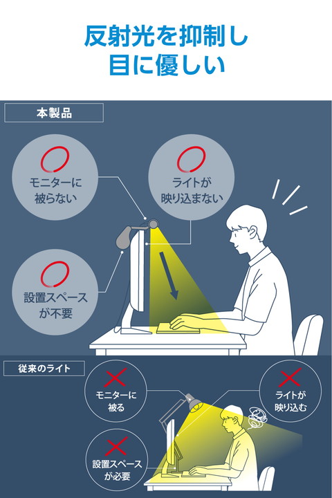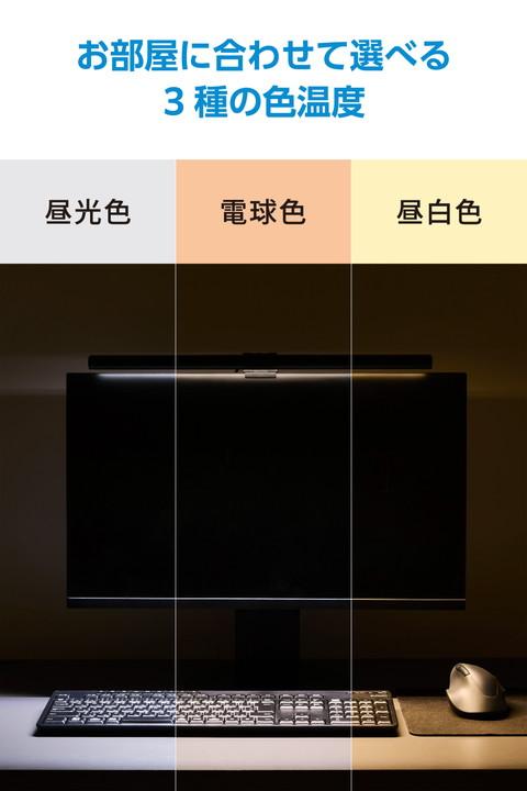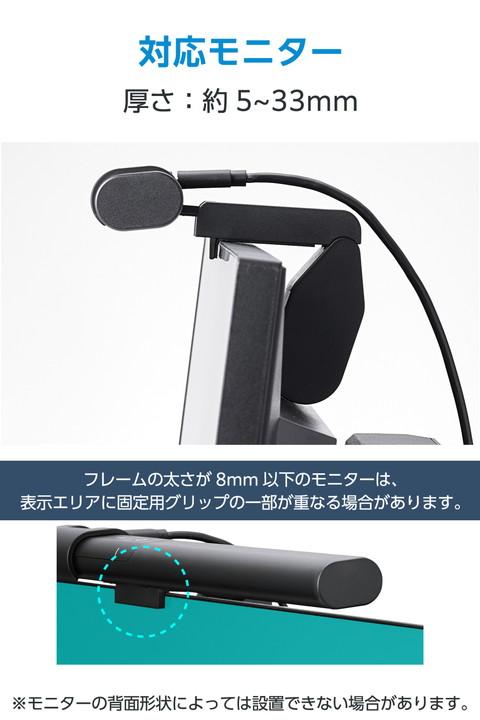 暗い部屋でも快適に作業できる!モニターに引っ掛けるだけで、手元を明るく照らすLEDモニターライトです。モニターへの反射を抑え、光が直接目に入りにくい設計で目の負担を軽減。高演色の自然な明かりで、明るさ10段階・色温度6段階の調節が可能です。![]() ■モニター上から手元を明るく照らし、テレワーク時や夜間でも、部屋の明るさを気にせず快適に作業できます。 ■LEDの光が直接目に入りにくい設計で、目の負担を軽減します。 ■輝度は10段階で調節でき、好みの明るさに設定可能です。 ■色温度は、電球色・昼白色・昼光色をベースにした3000K〜6000Kの6段階から選択可能。お部屋の照明やシーンに合わせて、色味を調整できます。 ■太陽光(Ra100)に非常に近い高演色Ra93の明かりで、手元の色をより正しく、鮮やかに表現します。 ■電源をOFFにしたときの色温度や明るさなどを記憶。次回起動時も、前回と同じ設定で使えます。 ■モニターの厚さは約5〜33mmまで対応。モニター上部のフレームに引っ掛けるだけで簡単に取り付けられます。 ■※ノートパソコン・タブレットパソコンには使用できません。 ■※フレームの太さが8mm以下のモニターは、表示エリアに固定用グリップの一部が重なる場合があります。 ■※カメラ搭載のモニター・モニター一体型パソコンでご使用になる時には、カメラ画像にハレーションを起こす場合や、カメラ部に固定グリップの一部が重なる場合がございます。 ■※モニターの背面形状によっては設置できない場合があります。 ■操作はライト上部のタッチパネルで行えるため、操作時もグラつきにくいです。 ■ライトの角度は柔軟に調節が可能で、照らす範囲を自由に変えられます。 ■※設置した機種・場所によっては前後に倒れる場合がありますので、ご注意ください。 ■滑り止め付きで安定感があり、固定器具を使わないためモニターを傷つけません。 ■本体は丈夫なアルミ合金製です。 ■ケーブルは取り回しのしやすい1.5mです。 ■手持ちの5V/2.0A以上のUSB-A対応のAC充電器などで使用が可能です。 ■自社環境認定基準を1つ以上満たし、『THINK ECOLOGY』マークを表示した製品です。 ■環境への負荷軽減のため、輸送効率を高める設計の外装箱を使用した製品です。 ![]() ■コネクター形状(電源入力側):USB Type-C(TM)コネクター ■定格入力電圧:5V ■定格入力電流:1.2A ■LED灯数:108個(白色・オレンジ:各54個) ■調光:6段階調色:電球色、昼白色(4段階)、昼光色 ■明るさ(全光束):約55lm〜約480lm ※積分球による全光束値 ■色温度:3000K〜6000K ■演色性:≧Ra93 ■直下照度:約700lx(約40cm直下) ※最大点灯時 ■付属品:USB-A - USB Type-Cケーブル ※AC充電器は付属していません。5V/2.0A以上のUSB-A対応AC充電器などを別途ご用意ください。 ■対応モニターサイズ:モニター厚さ:約5mm〜約33mm対応 ※フレームが8mm以下のモニターでは、表示エリアに固定用グリップが重なる、または設置できない場合があります。 ■外形寸法:LEDライト:幅約450mm×奥行約28mm×高さ約18mm、固定用グリップ:幅約45mm×奥行約100mm×高さ約82mm ■重量:LEDライト:約125g、固定用グリップ:270g ■ケーブル長:約1.5m ■カラー:ブラック ■動作温度:0〜40℃ ■保証期間:1年間 |