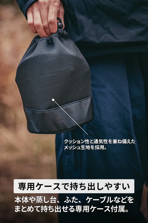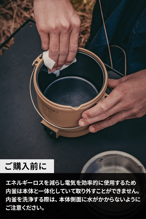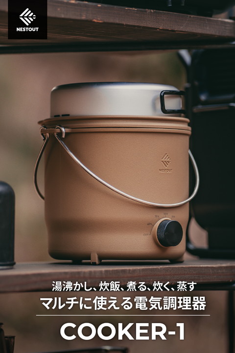 アウトドアでマルチに使える電気調理器です。お湯を沸かすほか、お米の炊飯、ラーメンやおでんなどさまざまな調理に対応します。消費電力が少ないため、多くのポータブル電源で使用できます。火を使わず、一酸化炭素(CO)も発生しないため、テント内や車内でも安心です。 ※ポータブル電源は別途ご用意ください。![]() ■アウトドアに特化したブランド NESTOUT(ネストアウト)の電気調理器“COOKER-1”です。 ■アウトドア用に開発された“COOKER-1”は、収納ケースが付属していて持ち運びがしやすく、屋外でも扱いやすい設計です。省電力仕様のため、さまざまなポータブル電源に対応できます。キャンプや車中泊でも使いやすいデザインです。 ■インスタントラーメンづくりやスープやシチューの煮込み、炊飯や肉まんの蒸し調理まで。多彩な調理をこの1台で手軽に楽しめます。 ■ガスや焚き火、炭火での調理は一酸化炭素中毒や火災の危険がありますが、“COOKER-1”は一酸化炭素が発生せず火も使いません。テント内や車内でも安全に調理でき、小さなお子様やペットがいる場合も安心です。 ■45℃・70℃・100℃の3段階の温度設定と炊飯、計4つの動作モードをダイヤルで選ぶだけ。シンプル操作で調理できます。 ■容量は最大800mlでお米は最大1.5合炊くことができます。1〜2人前の調理ができます。 ■[調理にかかる時間と消費電力の目安]湯沸かし(300ml):約5分/約35Wh、炊飯(1合):約40分/約85Wh ■※数値は参考値です。使用する機器の状態や使用状況により変わります。 ■コンセントにプラグを挿してダイヤルを回すだけなので、準備や後片付けも素早く楽にできます。 ■断熱構造で内釜への直接接触を防ぎ、本体表面の高温化を抑えます。本体にうっかり触れてもやけどしにくく、安心して使えます。 ■※本体にうっかり触れてもやけどしにくいですが、調理中や調理後はふたが熱くなります。使用中は高温部に触れないようにしてください。 ■内釜には調理用目盛り(蒸し・炊飯)と容量目盛りを刻印しています。 ■調理や保温の終了・切り替えなどをランプと音でお知らせします。 ■3点脚で設置するため、多少の凹凸がある場所でもぐらつきにくい設計です。 ■※極端な傾斜や不安定な場所では使用しないでください。 ■滑り止めのローレット加工を施した金属製の操作ダイヤルや、ふたを皿として使える仕様など、細部までこだわったデザインでアウトドアギアの所有欲を満たします。キャンプシーンに合わせやすい2色をラインアップ。 ■アルミ製のふたは側面に折りたたみ式取っ手付き。裏返すと、シェラカップのような皿として使えます。 ■内釜の内側にフッ素樹脂コートを採用。中身がこびりつきにくく、ラクに洗えます。 ■付属の専用ケースには、通気性とクッション性に優れたメッシュ素材を採用しています。本体を保護しながら、清潔に保てます。 ■本体は軽量で扱いやすく、2つの本体ハンドルで調理後の持ち運びもスムーズにできます。 ■電源コードは長さ約1m。キャンプ時などに取り回ししやすいコード長を採用しています。 ■防塵のため、電源差込口には電源カバーを備えています。 ■日本の電気用品安全法(PSE)の技術基準に適合した安全性の高い製品です。 ■※使用時は水平な場所に設置し、周囲の状況に注意のうえ、取扱説明書に従って安全に使用してください。 ■※本製品は内釜が外れない本体一体型です。 ■※本体の丸洗いはできません。外側をぬらさないように注意し、内釜を薄めた台所用中性洗剤で洗ってから、よくすすいで使用してください。 ![]() ■電源:AC100V 50Hz/60Hz ■定格消費電力:500W ■サイズ:幅約173mm×奥行約166mm×高さ約169mm ※蒸し皿除く ■有効内寸:内釜:直径約129mm×高さ約62mm、蒸し皿:直径約118mm×高さ約49mm、ふた:直径約128mm×高さ約35mm ■質量:約895g ※電源コード含む ■容量:800ml ■カラー:サンドベージュ ■電源コード長:約1.0m ■保証期間:1年間 ■付属品:ふた、専用ケース、電源コード用ケース、蒸し皿、電源コード、取扱説明書 ■機能:45℃/70℃/100℃切り替えモード、炊飯モード ■安全装置:サーモスタット、温度ヒューズ(290℃) ■温度設定範囲:45℃、70℃、100℃ ■時間設定範囲:各モード1時間後にOFF ■保温機能:あり:設定温度を1時間維持 |