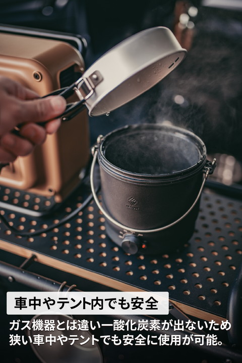 アウトドアでマルチに使える電気調理器です。お湯を沸かすほか、お米の炊飯、ラーメンやおでんなどさまざまな調理に対応します。消費電力が少ないため、多くのポータブル電源で使用できます。火を使わず、一酸化炭素(CO)も発生しないため、テント内や車内でも安心です。 ※ポータブル電源は別途ご用意ください。