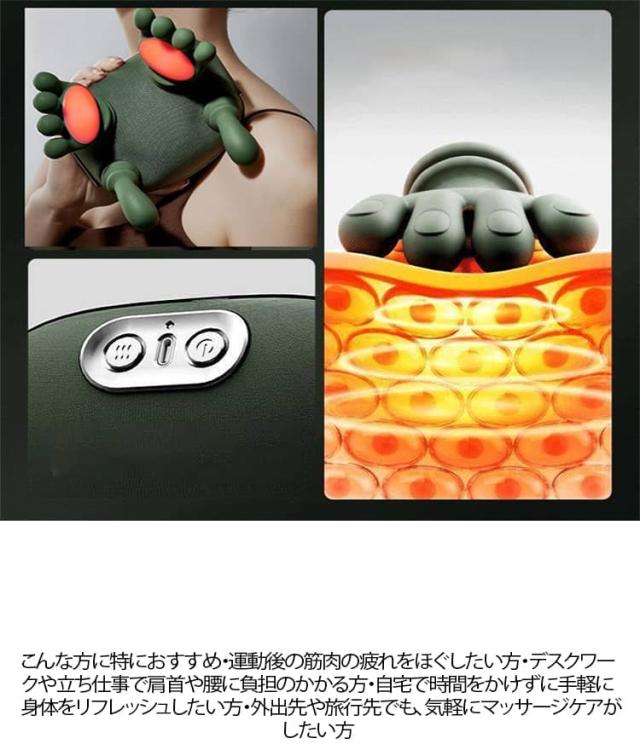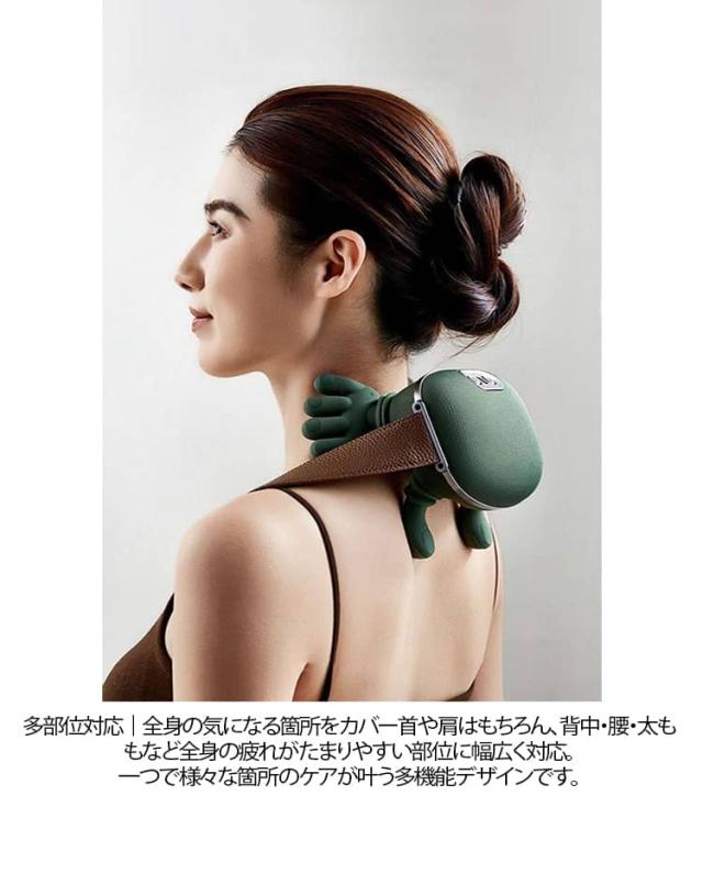 | 【人の手のような心地よさを再現】 人間工学に基づくハンド型デザイン 人の手でそっと支えてくれるようなハンド型造型を採用し、首や肩のカーブに自然に密着。違和感なく包み込むような使用感を実現します。 肩首ラインに沿うカーブ設計 肩首の生まれつきのラインにフィットする曲線設計で、装着時のズレや浮きをしっかり抑え、安定した使い心地を実現。デスクワークの合間や家事のスキマ時間に、手軽に使える使い勝手を追求しました。 コードレス充電式|場所を選ばない快適な使用感 コードレス仕様なので、自宅のリビング、オフィスのデスク周り、外出先や移動中も電源に縛られず使用可能。充電式で取り回しがスムーズ、日常の様々なシーンに溶け込む便利さを備えています。 多部位対応|全身の気になる箇所をカバー 首や肩はもちろん、背中・腰・太ももなど全身の疲れがたまりやすい部位に幅広く対応。一つで様々な箇所のケアが叶う多機能デザインです。 軽量コンパクト|収納・持ち運びもラクラク 軽量かつコンパクトな設計で、バッグに入れて持ち運んだり、家の小さなスペースに収納したりも簡単。毎日の疲れをリフレッシュするための、身近なパートナーに最適です。 こんな方に特におすすめ ・運動後の筋肉の疲れをほぐしたい方 ・デスクワークや立ち仕事で肩首や腰に負担のかかる方 ・自宅で時間をかけずに手軽に身体をリフレッシュしたい方 ・外出先や旅行先でも、気軽にマッサージケアがしたい方 【使用上のご注意】 ・同一部位への長時間使用はお控えください ・痛みや異常を感じた場合は直ちに使用を中止してください ・医療目的での使用はできません ・お子様の手の届かない場所で保管してください | |