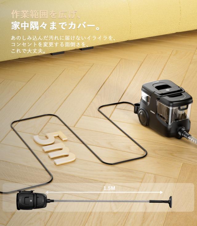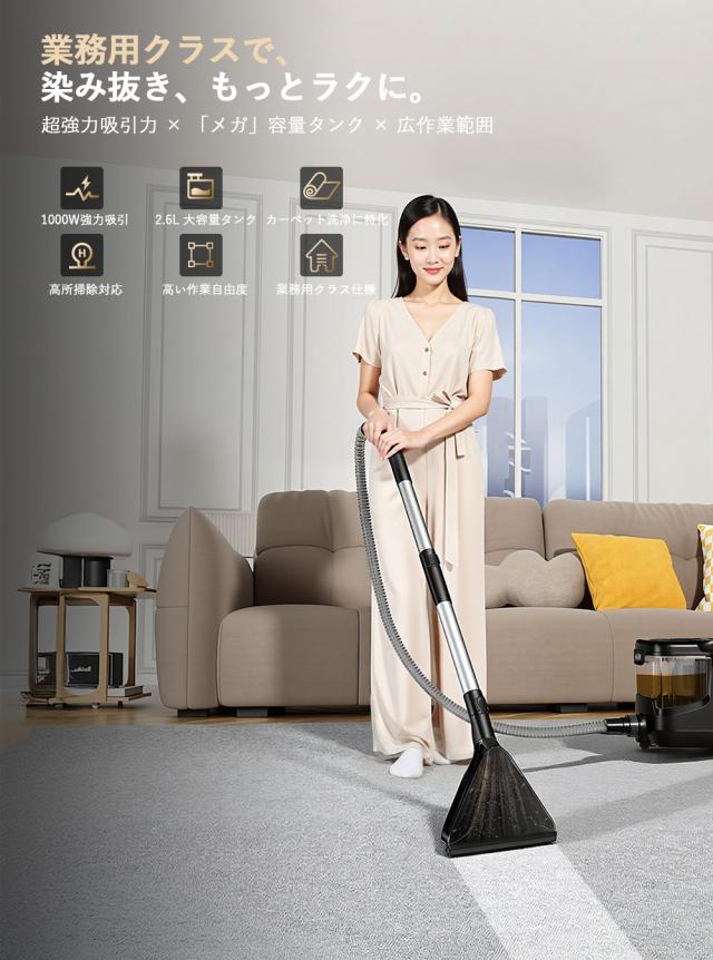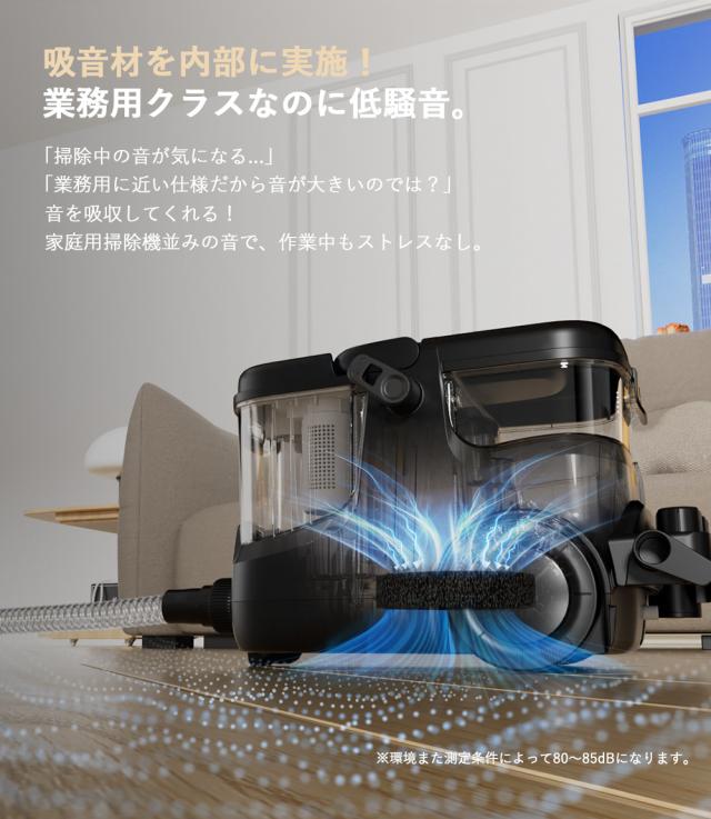 驚きの1000W吸引力で、ソファやカーペットに染みついたシミや長年のホコリもしっかりと除去します。家庭用では落ちにくい汚れも、業務用ならではのパワーでスピーディーに清掃可能です。手軽に使えて、快適な空間をストレスなく保てます。