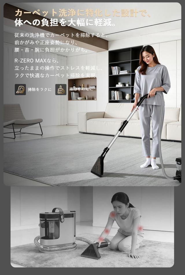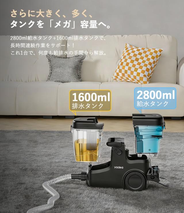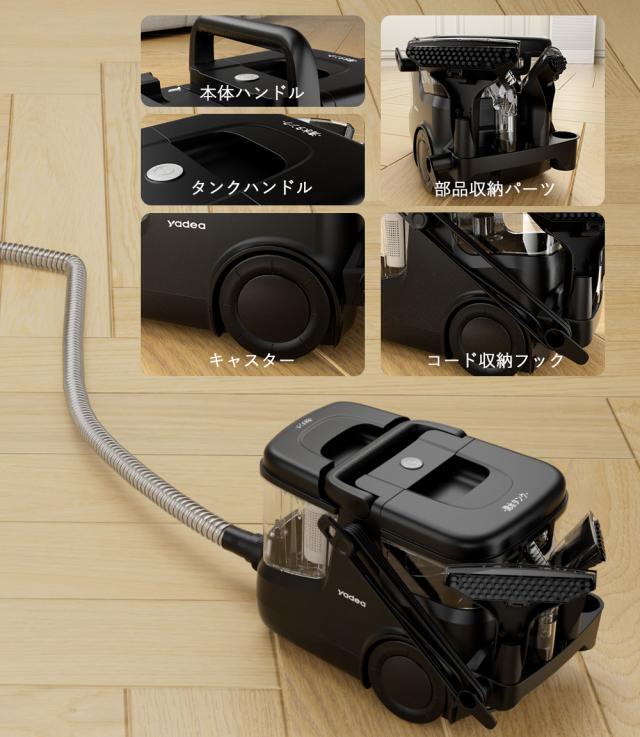 Yadea R-ZERO MAXは家庭用から業務用まで対応するカーペット洗浄機です。オフィスやホテルなどの広範囲のカーペットや布張りに特化しており、業務用はもちろん、家庭用にも最適です。汚れた箇所に水を吹きかけて汚れを浮かせ、その汚れと水を一緒に吸引します。湿った液体の汚れだけでなく、乾いた汚れや洗剤使用後の水分も吸い取ることができるクリーナーです。