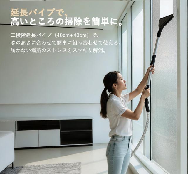 付属の延長パイプで、広いカーペットを楽に掃除できます。広いガラス面でも、低い位置の汚れもしゃがまずにきれいにできます。さらに、高い位置にも楽に届くため、踏み台を使う手間も不要です。業務用としても家庭用としても、負担をかけることなく隅々まできれいにできます。