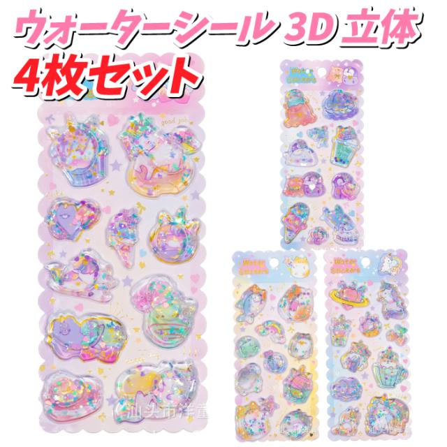 【4枚セット】ウォーターシール 水入りシール かわいい キャラクター 女の子 立体シール 立体 ユニコーン シール帳 キラキラ 動物シール シール 水入りシール