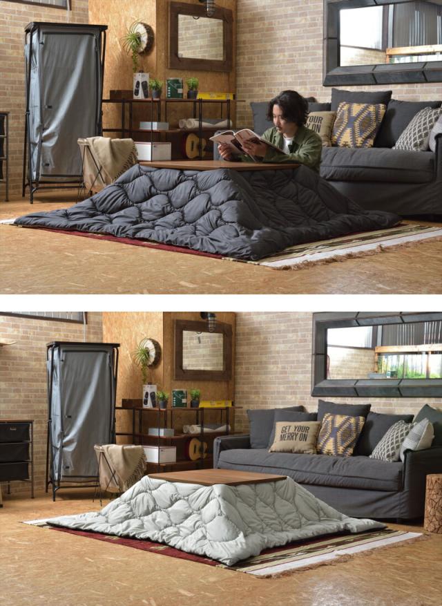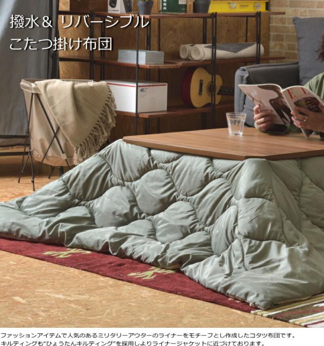 ファッションアイテムで人気のあるミリタリーアウターの ライナーをモチーフとし作成したコタツ布団です。 キルティングも“ひょうたんキルティング”を採用しより ライナージャケットに近づけております。 さらにリバーシブル仕様となっておりますので1つで2つのカラーを 楽しむことができ気分によって気軽に変えることができます。 撥水機能も付いておりメンテナンスも手軽に行なえます。 ※撥水は使用頻度によって効果が低下します。 また、洗濯機で洗うことも可能です。 ※液温は30℃を限度とし、洗濯機で弱い洗濯ができます。