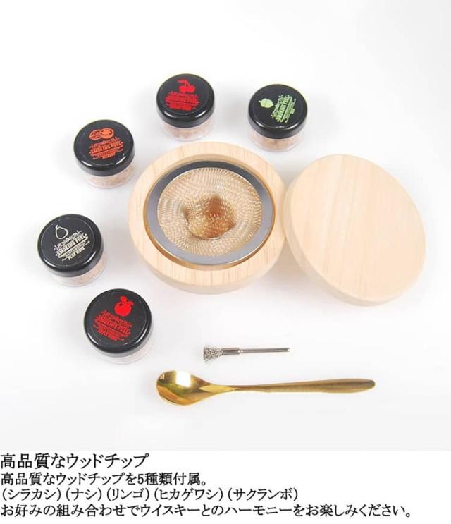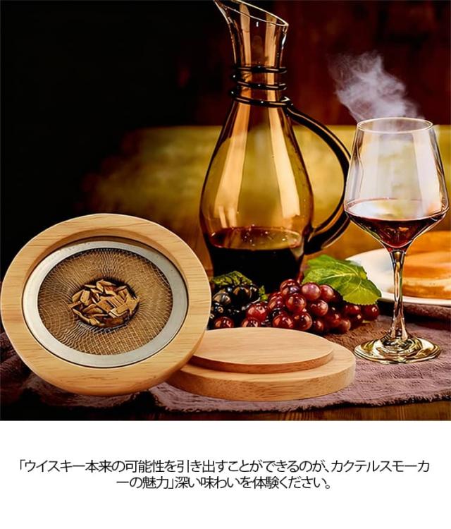 | 「ウイスキー本来の可能性を引き出すことができるのが、カクテルスモーカーの魅力」 深い味わいを体験ください。 洗練されたデザイン デザイナーが試行錯誤を重ねたどり着いた形状と素材感。 使いやすいシンプルデザインはオシャレな雰囲気を損ねることがありません。 燻製の煙が落ちる様子はとても幻想的。 燻ている時間もゆっくり楽しむことができるので、おもてなしにも好評です。 延焼防止アダプター チップ燃焼時に本体への延焼を防ぐ延焼防止アダプターが付属しています。安心して、 全てのチップを燃焼させることができます。 ※熱により多少の変色は生じることがあります。 高品質なウッドチップ 高品質なウッドチップを5種類付属。 (シラカシ)(ナシ)(リンゴ)(ヒカゲワシ)(サクランボ) お好みの組み合わせでウイスキーとのハーモニーをお楽しみください。 使い方 01. 本体をグラスにセットし、チップを入れます 02. バーナーなどでチップを燃焼させ、 煙をグラスに充満させます。 03. 本体の蓋を閉め、薫りをゆっくりとお酒に移していきます。 04.2-3分ほど待ったら、燻製完了です。 芳醇な薫りをお楽しみください。 | |