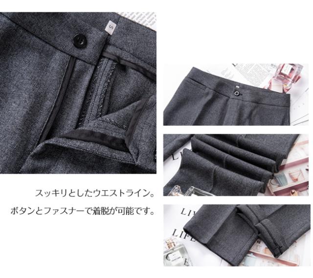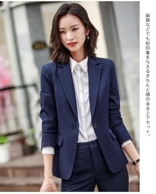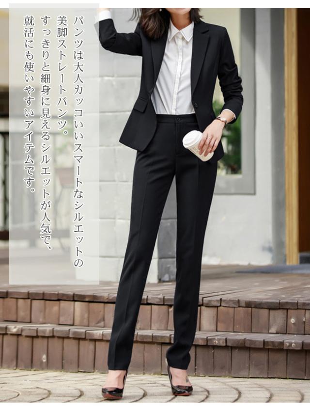 パンツは大人カッコいいスマートなシルエットの美脚ストレートパンツ。すっきりと細身に見えるシルエットが人気で、就活にも使いやすいアイテムです。