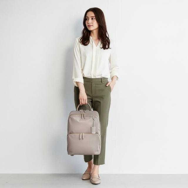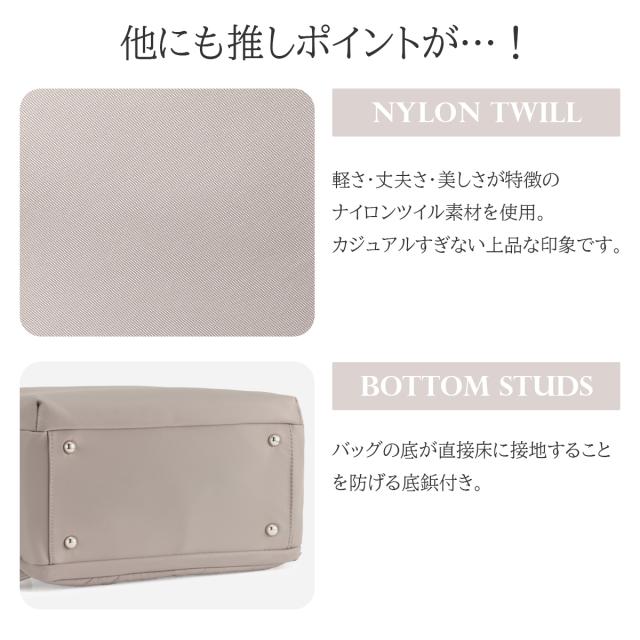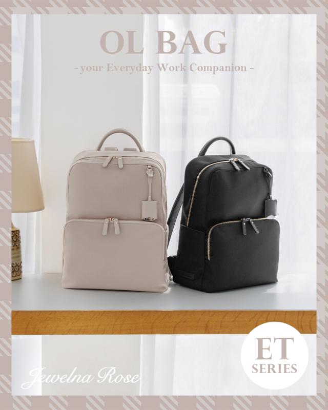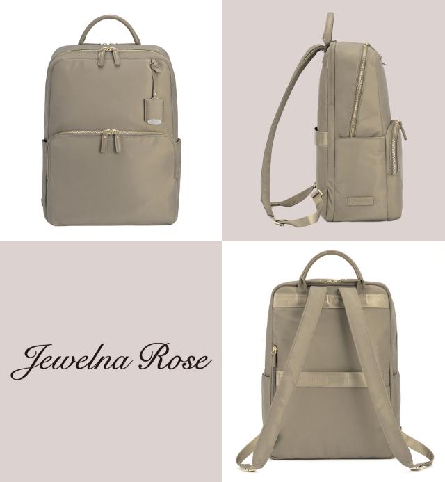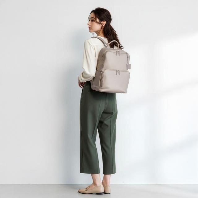 | Jewelna Rose 人気No.1リュックシリーズからナイロンVer.が登場! 機能性はそのままに、お好みに合わせて本体素材を選べるようになりました♪ 【おすすめポイント】 ・A4サイズ/14.0インチPC収納可能 ・メイン収納ルーム+PC専用ルームの2ルームタイプ ・機能性に富んだ豊富なポケット ・オン・オフ使えるベーシックなデザイン 上品でミニマルな、すっきりとしたデザインが特徴のリュック。 角に丸みを持たせたスクエアシルエットで女性らしい柔らかさとスマートさを演出。 ツヤ感のある上品なナイロン素材×表情のある合皮のポイント使いで 洗練されつつも可愛らしさの残る印象に仕上げました。 メイン収納にはPC周辺機器を収納しやすいマチ有りポケットや、 アクセサリーの収納にぴったりな深さの浅いファスナーポケット、 ボトルホルダーなど、荷物の整理整頓がしやすい工夫がたくさん! A4クリアファイル(W22×H31cm)を収納可能なポケットも設置しているので、 大事な書類もきっちり収納できます。 背面収納にはPCを収納するのがおすすめ。 14.0インチPC(W33×H24×D2.5cm)が収納可能なサイズ感です。 ファスナーはダブル仕様。 開け口のサイドがナナメにカットされているので、 開けやすく、中身が見やすい設計になっています。 外装には背負ったままアクセスできるポケットを複数設置。 スマートフォンや定期の収納に便利です。 背面にはスーツケースに固定できるセットアップベルト付き。 着脱可能な付属チャームはジュエルナローズのロゴ入り。 ミラー代わりとしてメイクチェックにも活躍してくれます。 ハンドバッグのように持てるしっかりとしたトップハンドルはビジネスシーンでも役立ちます。 充実の13ポケット搭載! 【内装ポケット】 ・マチ有りオープンポケット×2 ・A4サイズオープンポケット×1 ・ファスナーポケット×2 ・ボトルホルダー×1 【外装ポケット】 ・フロントポケット×1 ・オープンポケット×3 ・背面ポケット×1 ・サイドポケット×2 Jewelna Rose / ジュエルナローズ いつの時代も女性たちはしとやかな美しさとゴージャスな強さの2つのハートを持ち合わせ、シーンで使い分けながら毎日の生活をひた向きに生きている・・・そんな時代のミューズの為の新世代型バッグブランドです。 ジュエリーを身につける感覚で、日々のスタイリングに合わせたコーディネートのスパイスや、時には主役となるトレンドミックスなバッグを提案します。 |