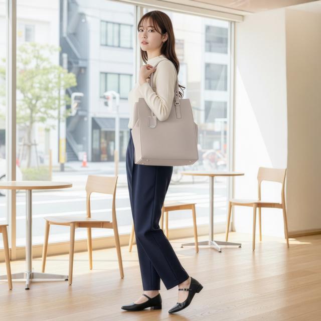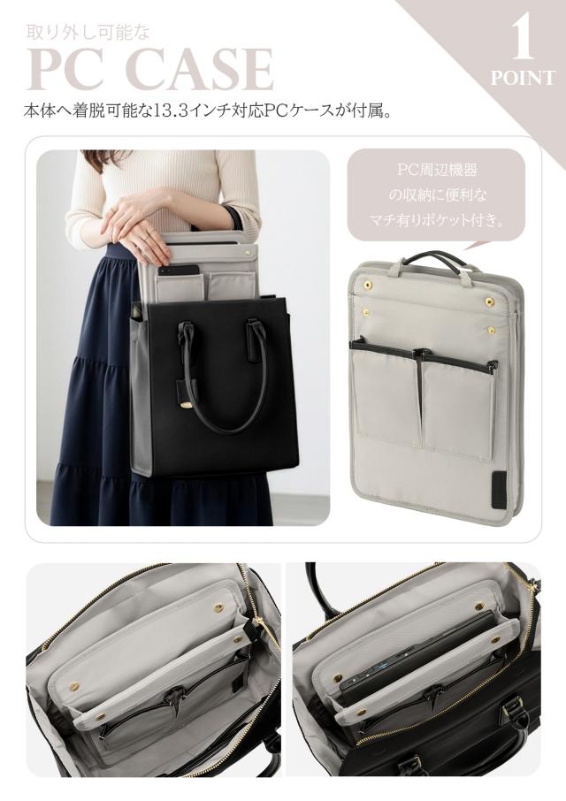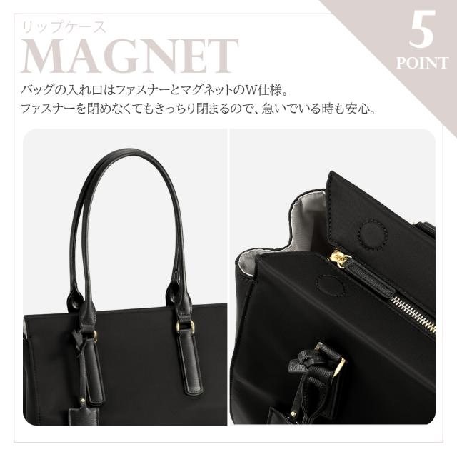 | Jewelna Rose 人気No.1お仕事トートからナイロンVer.が登場! 機能性はそのままに、お好みに合わせて本体素材を選べるようになりました♪ 【おすすめポイント】 ・取り外し可能なPCケース付き ・ランチボックスなど奥行のあるものも収納しやすい広めのマチ幅 ・入れ口が大きく開くので、荷物の出し入れがラクチン ・用途に合わせて使える様々なタイプのポケットが充実 A4サイズのファイルや13.3インチPCを持ち歩く方におすすめのバッグです。 上品なツヤ感のあるナイロン生地を使用し、きれいめな印象に仕上げました。 「OLバッグといえば!」なマグネットフラップを採用。 ワンタッチで開閉ができるので、急いでいるときにも便利です。 ファスナーを閉めなくてもきちんと見えするのが嬉しいポイント! ハンドル部分は倒れるように設計されているので、座った時に邪魔になりません。 マチ幅が広いので、ランチボックスなどもすっきり収納できます。 書類やPC、ペットボトルやメイクポーチなど、必要な荷物をしっかり収納できる 少し大きめなお作りなので大荷物さんにもおすすめです。 付属のチャームはジュエルナローズのロゴ入り。 ミラー代わりとしてメイクチェックにも活躍してくれます。 13.3インチPCを収納可能なPCケースが付属しています! 取り外し可能でハンドルもついているので、バッグの中でのPC収納はもちろん、 オフィス内でのPCの持ち運びにもお使いいただけます。 バッグ本体にもPCケースにも、様々なタイプのポケットを豊富に設置しました。 本体&PCケース合わせて17ポケット搭載! 【内装ポケット】 ・ベタポケット×4 ・アクセサリーポケット×1 ・ファスナーポケット×1 ・サイドポケット×2 ・ボトルホルダー×1 ・ペンホルダー×1 【外装ポケット】 ・背面ポケット×1 ・背面ポケット内 ベタポケット×2 ・背面ポケット内 ペンホルダー×1 【PCケース】 ・マチ付きポケット×2 ・ベタポケット×1 Jewelna Rose / ジュエルナローズ いつの時代も女性たちはしとやかな美しさとゴージャスな強さの2つのハートを持ち合わせ、シーンで使い分けながら毎日の生活をひた向きに生きている・・・そんな時代のミューズの為の新世代型バッグブランドです。 ジュエリーを身につける感覚で、日々のスタイリングに合わせたコーディネートのスパイスや、時には主役となるトレンドミックスなバッグを提案します。 |