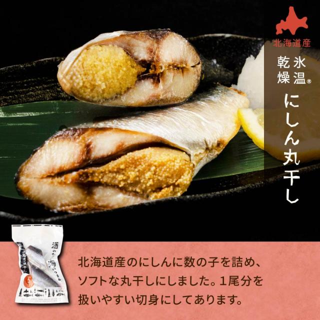 「氷温乾燥一夜干し」で魚が凍る直前の温度でじっくりと水分だけを取り除き、魚の細胞を壊すことなく、生に近い、ふっくらとした食感に仕上げています。1尾分を扱いやすい切身にしてあります。北海道産のにしんに数の子を詰め、ソフトな丸干しにしました。1尾分を扱いやすい切身にしてあります。