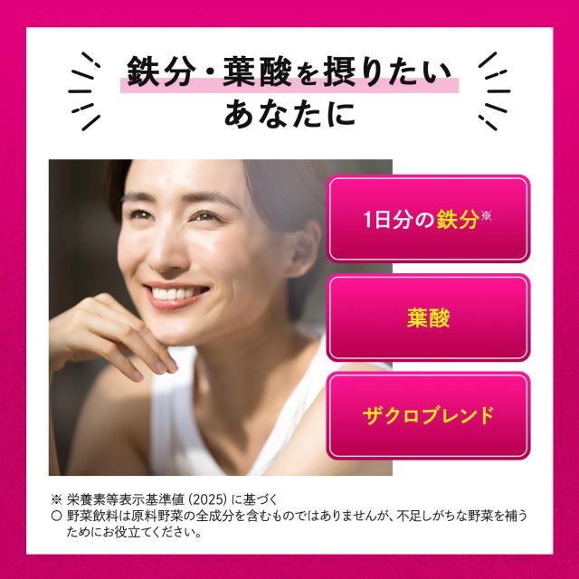 1日分の鉄分※と7〜34μgの葉酸が摂れます。14種の野菜と5種の果実使用。砂糖不使用です。