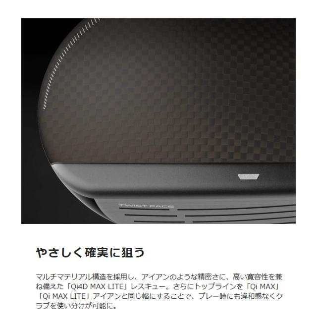 ロングアイアンに不安を感じる時、フェアウェイウッドでは飛びすぎる時。そんなシーンで頼れる「Qi4D」レスキュー。ツイストフェースや貫通型スピードポケットなど信頼のテクノロジーを継承しながら、マルチマテリアル構造で重心位置を最適化。安定した飛びと狙い通りの弾道を実現。さらにレスキューにも「TASウェイト(*)」が搭載されたことで、調整幅はこれまでにない領域へ。確信をもって攻める、その一打に「Qi4D」レスキューという選択肢を。