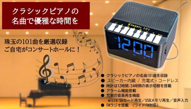 ■本体付属のmicroSDカードには、珠玉のクラシックピアノ曲が101曲収録されています。BGMとして流せば、いつものお部屋が上質なリラックス空間へ。■インテリアに馴染むピアノをイメージしたスタイリッシュなデザイン!幅約10.5cmの手のひらサイズで、インテリアのアクセントとしてデスクや棚に美しく馴染みます。■充実のアラームクロック機能!視認性の高いデジタル時計に、充実のアラーム機能を搭載。メロディーや小鳥の声など、全5種類から選べるアラーム音に加え、スヌーズ機能や音量調節も完備。■マルチオーディオ!●機能音楽再生:付属のmicroSDカードだけでなく、お手持ちのUSBメモリやmicroSDカード(MP3ファイル)も再生可能。●FMラジオ:日本国内のFM放送に加え、ワイドFM(76-108MHz)にも対応。●外部スピーカー:AUX端子を搭載しており、スマートフォンなどの外部機器と接続してスピーカーとしても使用できます。【注意事項】※本製品には充電用のUSBアダプタ(ACアダプタ)は付属しておりません。充電の際は、別途5V/2A出力が可能な市販のUSBアダプタをご用意ください。■セット内容/本体、USBケーブル、ピアノ曲101曲収録 microSDカード(本体装着済)、取扱説明書(保証書付)