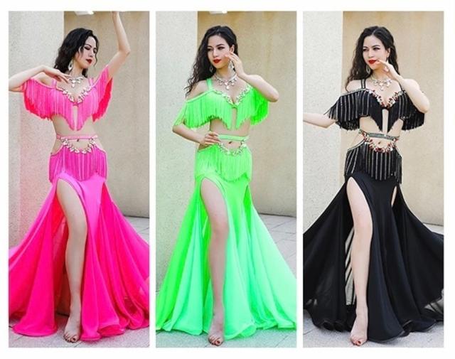 ベリーダンス 衣装 パフォーマンス用 ラグジュアリー 3点セット ブラ・ロングスカート・ストーン付きショーツ(大人用 M・L)ピンクカラー