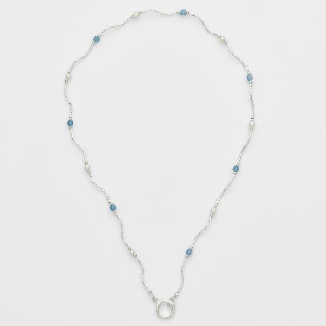 涼やかなアクアマリと淡水パール、そしてシルバーの調和が、すっきりとした印象のネックレス。甘さを感じる組み合わせながら、細やかなカットを施したシルバーのパイプをベースにすることで、洗練されたスタイリッシュなムードに仕上げています。開閉できるサークル状の金具にネックレスチャームを通せば、お手持ちのチャームとの組み合わせも自由自在。重ね付けのスタイリングをより洗練された印象に仕上げます。金具を後ろに回すことで、シンプルなチェーンネックレスとしてもお使いいただけます。※天然石や天然素材を使用しているものは、サイズ・色味・風合いの違いや、若干の傷、内包物の有無などに個体差があります。予めご了承ください。※ワイヤーは折れないように保管をお願いします。