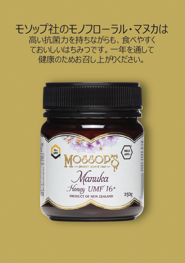 ◆モソップハニー社は三世代続く家族経営の養蜂場で、NZ北島タウランガ市に1947年に創立されました。巣箱管理から小売り用パッキングまで、一貫して自社で行うはちみつ生産会社です。「モソップ」はモソップ家の名字です。