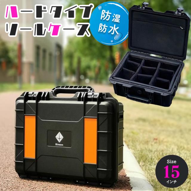 リールケース 防水 ハードタイプ 小物入れポケット付き リールバッグ リールボックス 収納 黒色 (15インチ)