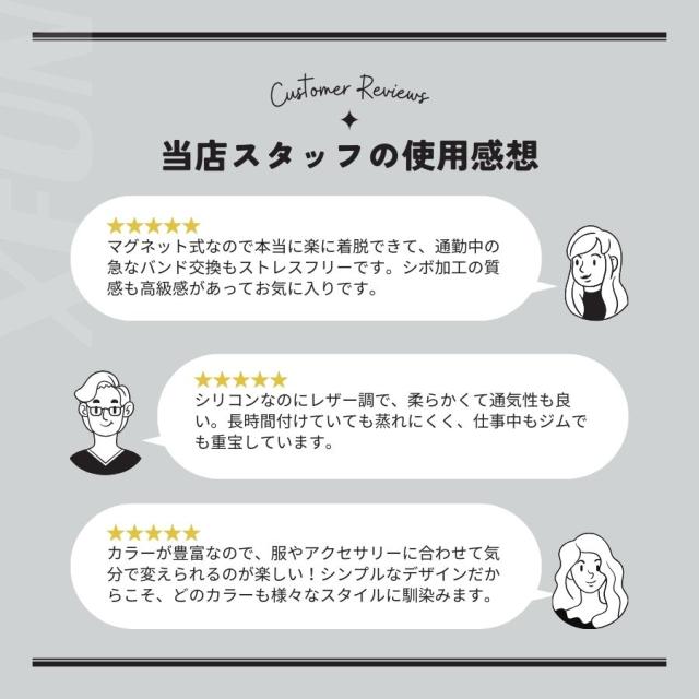 【デザイン】 高級感あるリザードレザー調のシボ加工を施したシリコン素材で、通気性と柔らかな装着感を実現。シンプルでミニマルなデザインなので、どんな服やシーンにも合わせやすいです。