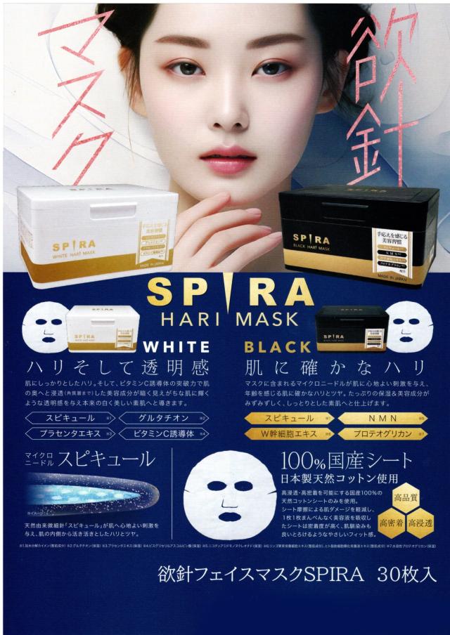 欲針フェイスマスクSPIRA 30枚入 ホワイト ブラック100%国産シート 日本製天然コットン使用(欲針 スピラ スピキュール、NMN、グルタチオン、プラセンタエキス、ビタミンC誘導体、プロテオグリカン、W幹細胞エキス配合)