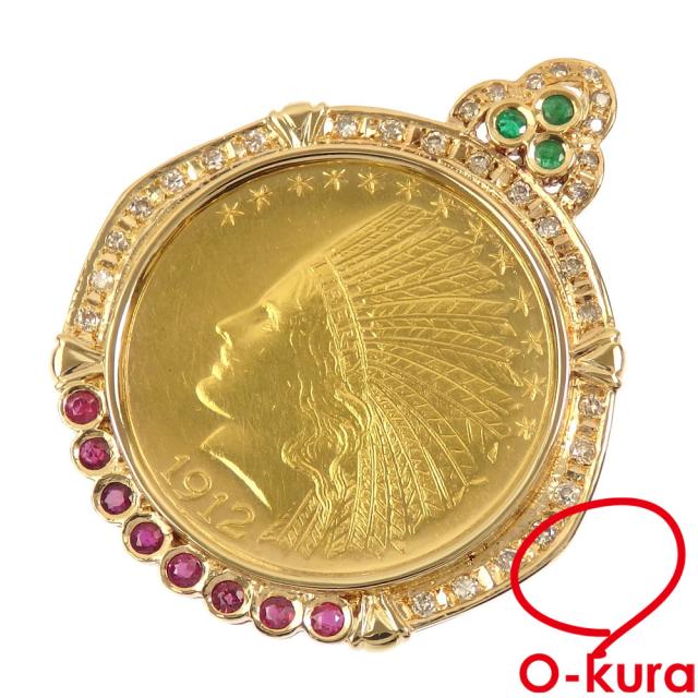 中古 マルチストーン付き ゴールドコイン ペンダントトップ レディース K18YG枠 K21.6YG 24.5g 18金 21.6金 750 イエローゴールド ペンダントヘッド ダイヤモンド エメラルド ルビー インディアン 金貨 10ドル 1912