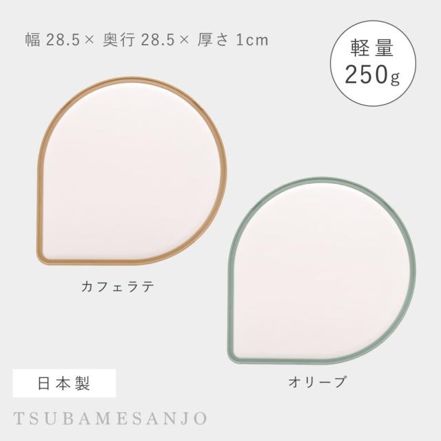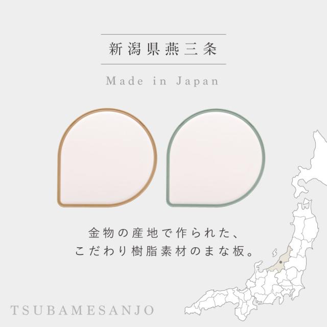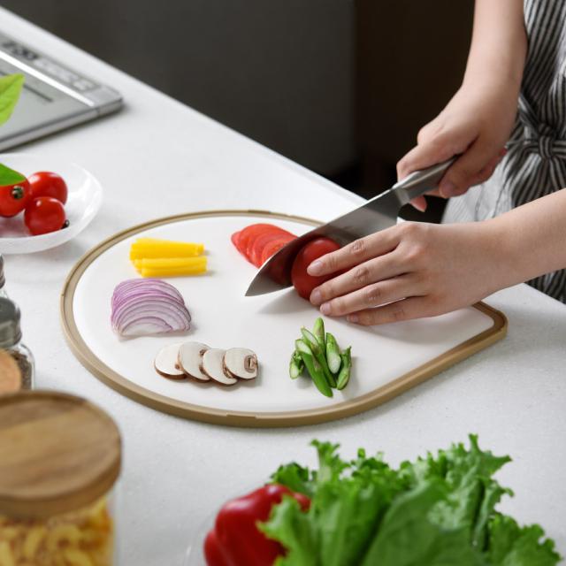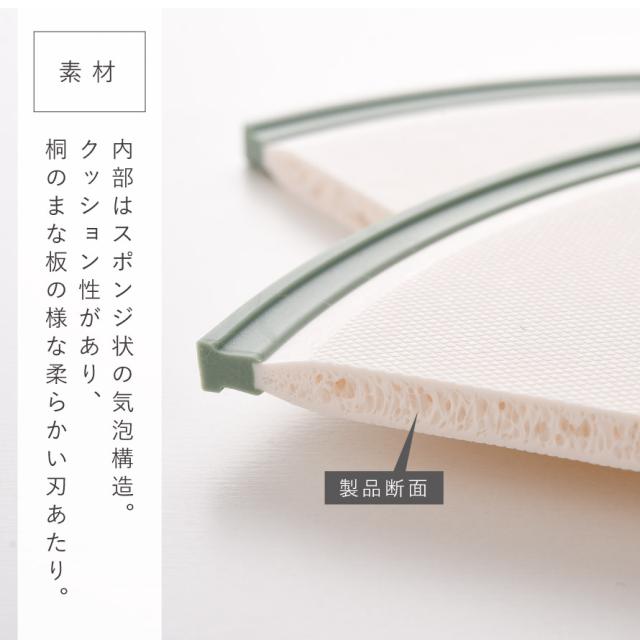 しずく型で、切った食材を寄せるスペースとカットスペースを確保できる、作業性にこだわったまな板。内部はスポンジ状の気泡構造。クッション性があり、桐のまな板のような刃あたりの柔らかい優しい切り心地を実現。