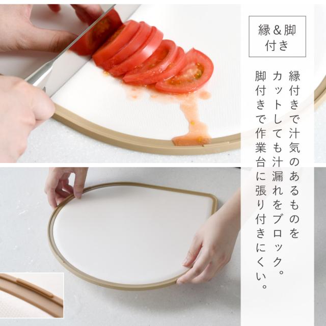 フチ付きで汁気のあるものをカットしても汁漏れをブロック。脚付きで作業台に張り付きにくい仕様です。