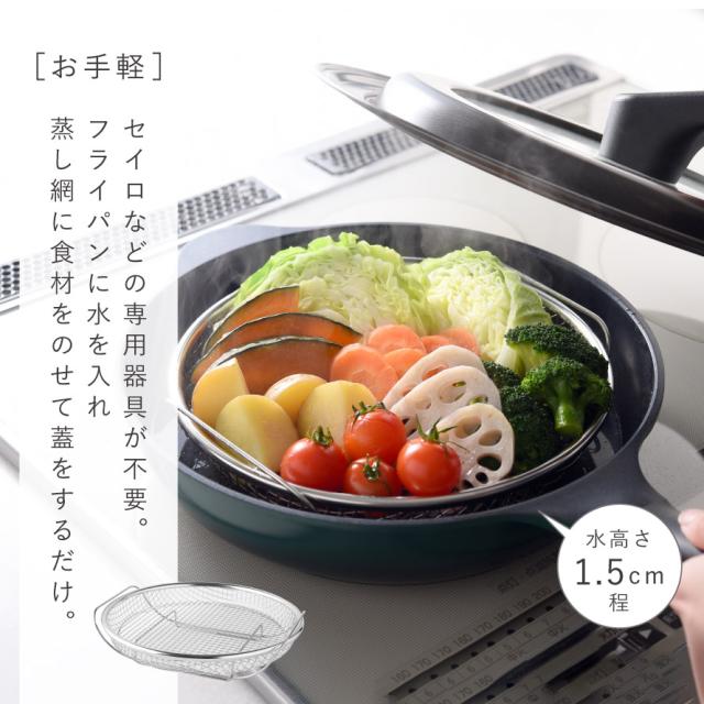 フライパンで手軽に蒸し料理が楽しめる「蒸し網用スタンド+お皿のざる22cm」のセットです。セイロや蒸し器などの専用調理器具を使わずに、普段お使いのフライパンを蒸し器として活用できます。フライパンに水を入れ、蒸し網に食材をのせて蓋をするだけで簡単に本格蒸し料理が完成します。