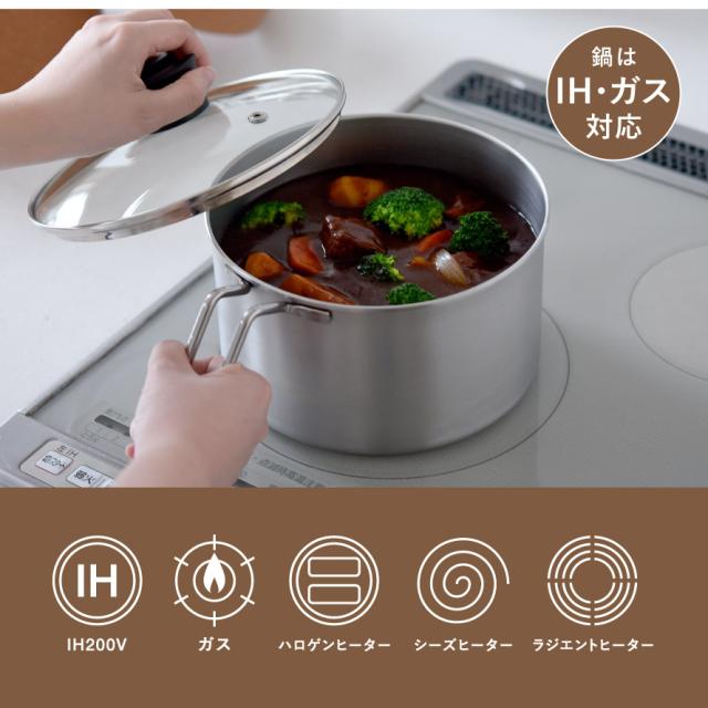 ■サイズ:鍋/内径18cm、深さ11cm、底厚0.7mm、幅28×奥行19×高さ11.5cm、蓋/直径19×高さ6cm、保温容器/直径22×高さ19cm(フタ含む)
