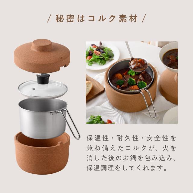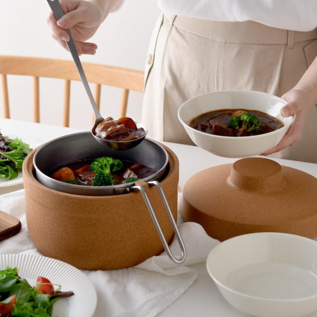 コルクの力で保温し、火を使わずに調理が進む新しい鍋。ほったらかしでも本格煮込み料理が完成します。