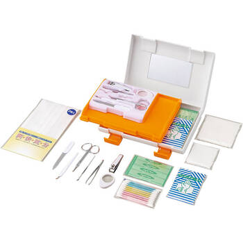 ケース:145×195×45mm、キズテープM×3、カラー綿棒×10、ワンタッチ包帯、コットンパフ×3、マスク2P、ガーゼ(中)×5、爪切り、エチケットハサミ、耳かき、爪ヤスリ、毛抜き兼ピンセット、キューティクルカッター、ルーペ