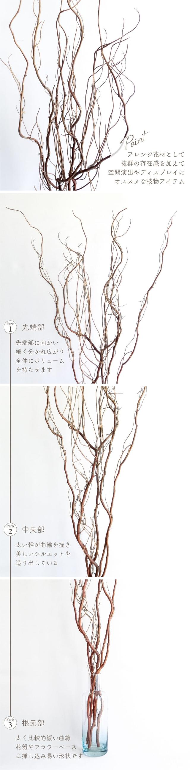 アレンジ花材として抜群の存在感を加えて、空間演出やディスプレイにオススメな枝物アイテム。先端部に向かい細く分かれ広がり、全体にボリュームを持たせています。中央部は太い幹が曲線を描き美しいシルエットを造り出しいます。根元部は比較的緩い曲線なので、花器やフラワーベースにも挿し込みやすい形状です。