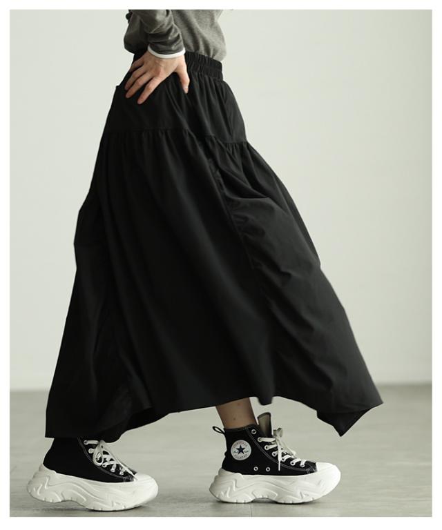 特徴: ギャザー フレア 切り替え ウエストゴム アシンメトリー イレヘム 裏地