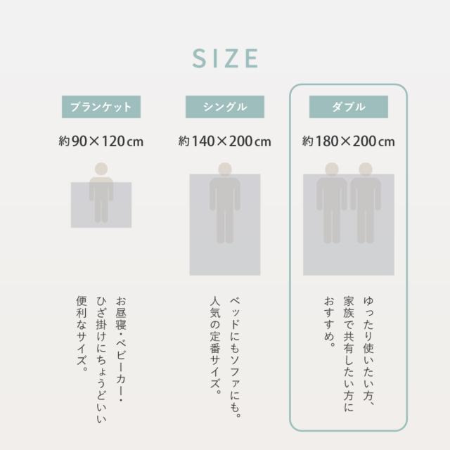 ![]() ブランケットサイズ 90×120cm | ![]() シングル 140×200cm | ![]() ダブル 180×200cm 【▲このページの商品】 |