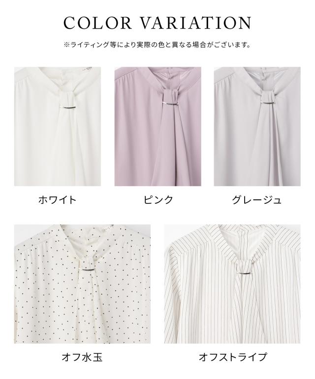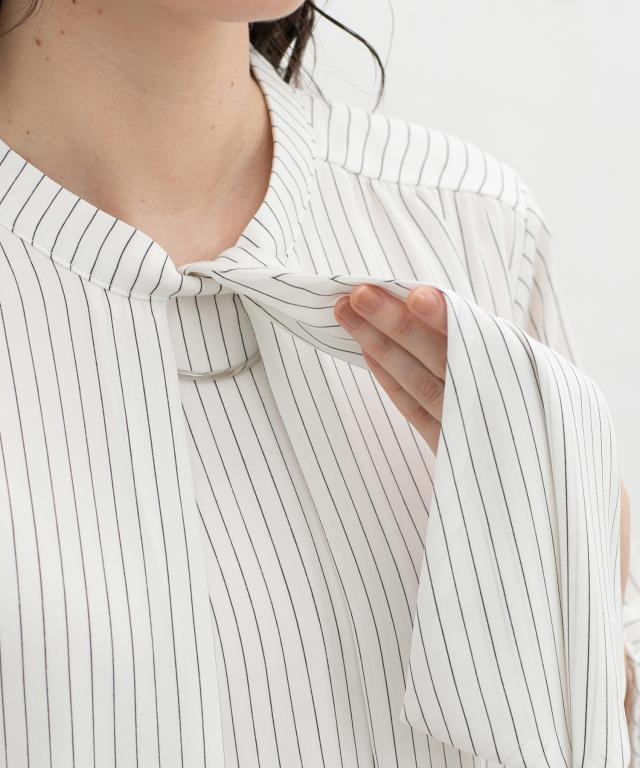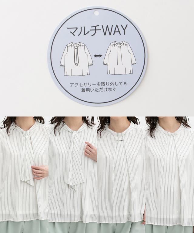 ボウタイを内側に入れたスタンドカラー、襟元のさりげなく華やかなアクセサリーも取り外したシンプルスタイルと、シーンや気分に合わせて着こなしのアレンジが楽しめるマルチway仕様。