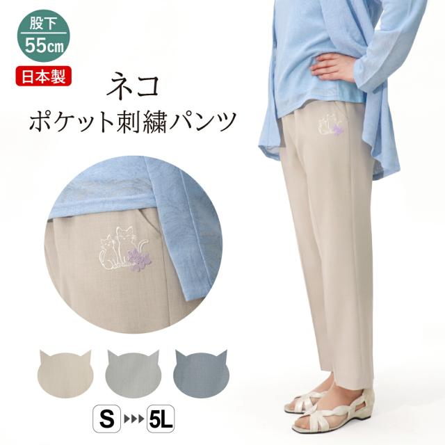 日本製 シニアパンツ シニアファッション ポケットにワンポイントの猫刺繍を施したパンツ。春・夏におすすめ。ミセス 大きいサイズ 小さいサイズ ゆったり 高齢者 シニア 婦人服 服