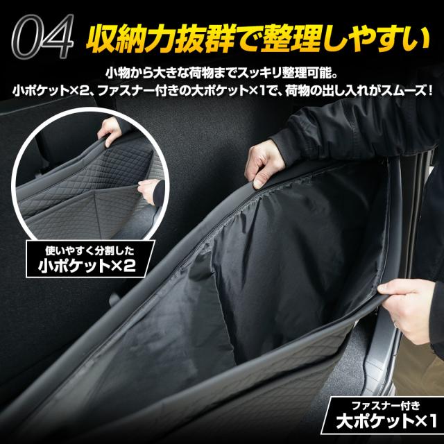 トヨタ90系 NOAH・VOXY専用のラゲッジ保護収納マットで、荷物の落下やリアハッチの傷から愛車をしっかり守ります。 荷物の出し入れ時は上だけ外せばバンパーの傷も防止でき、使い勝手も抜群です。 小ポケット×2、ファスナー付き大ポケット×1で収納力もたっぷり、荷物を整理しながら快適にカーライフを楽しめます。 高級感あるPVCレザーは耐摩擦・耐熱・防水性に優れ、お手入れも簡単。 取り付けは4か所をかけるだけの簡単設計で、すぐに愛車を保護できます。 これ一枚で、毎日のドライブも安心・快適に! |
