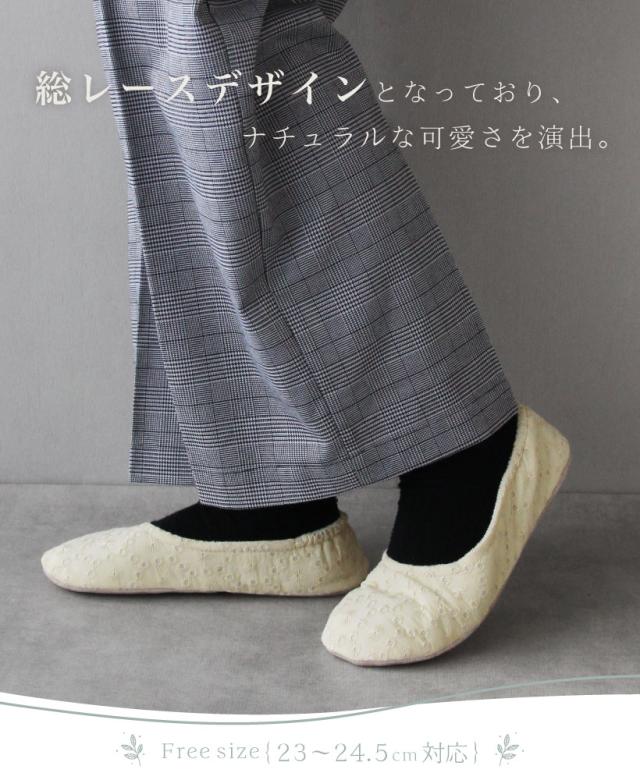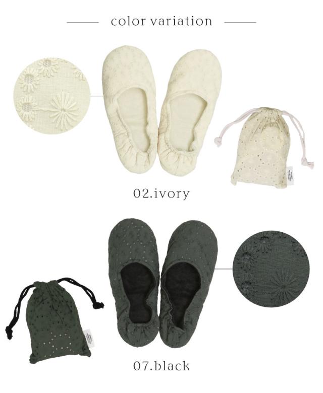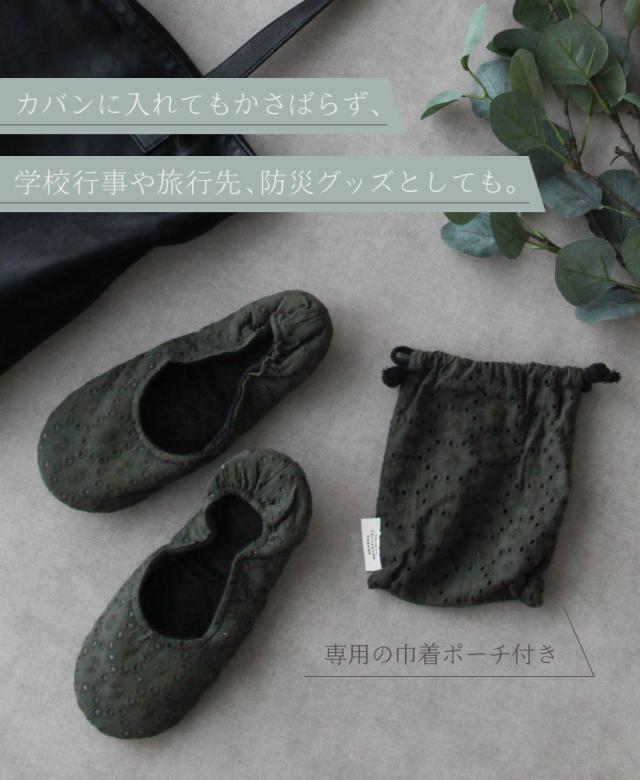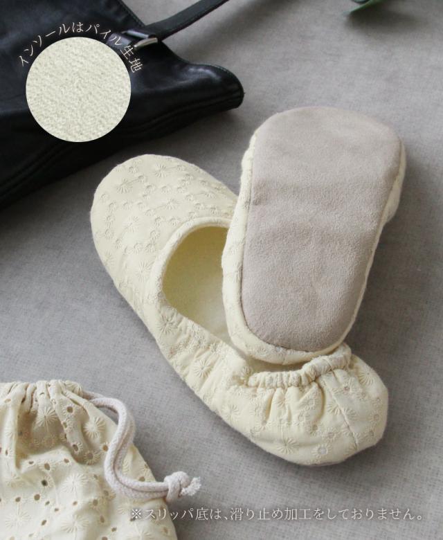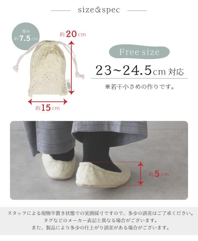専用の巾着に収納して持ち運べる携帯スリッパ。カバンに入れてもかさばらないコンパクトなサイズ感。ナチュラルな可愛さを演出してくれる総レースデザインは、入園・入学シーズン等のセレモニーアイテムにぴったり◎その他にも、旅先のホテル、飛行機の室内履きなど使い方は色々。