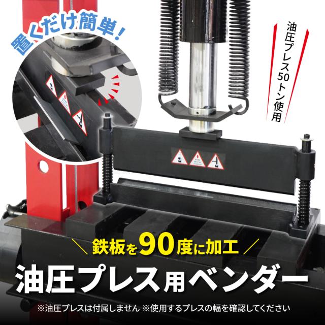 置くだけ簡単設置!鉄板の曲げ加工に ●油圧プレス用アタッチメントです ●作業幅530mm以上の油圧プレスでご使用ください ●本品は組み立てが必要な商品です(必要工具:六角レンチ 6mm) ※組立方法は付属の取扱説明書にてご確認ください ●油圧プレス本体は別売りです 品番:PBA-2 |