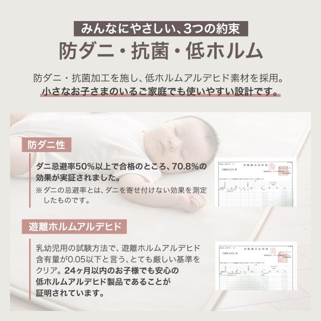 防ダニ・抗菌加工+低ホルムアルデヒド素材でお子様のいるご家庭にも。