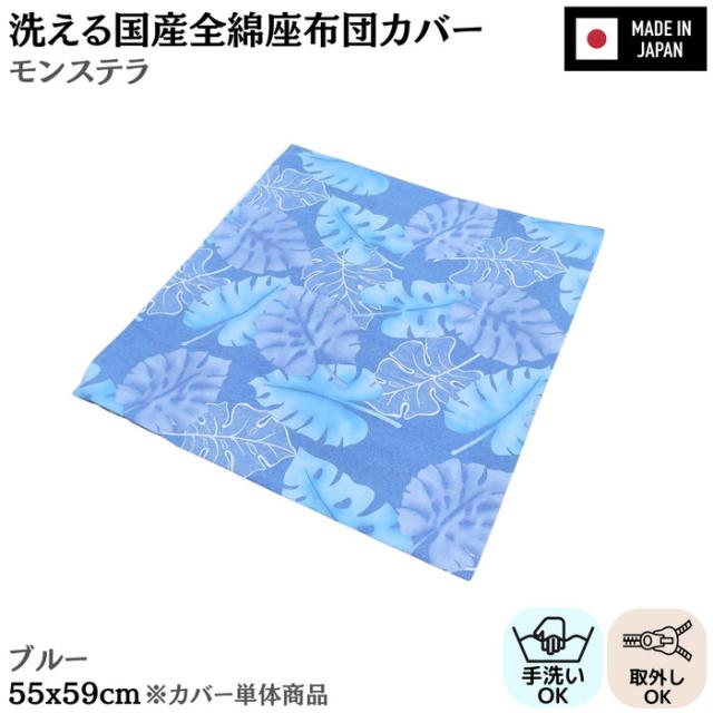 洗える国産全綿座布団カバー モンステラ ブルー 綿100% 日本製 ファスナー付き
