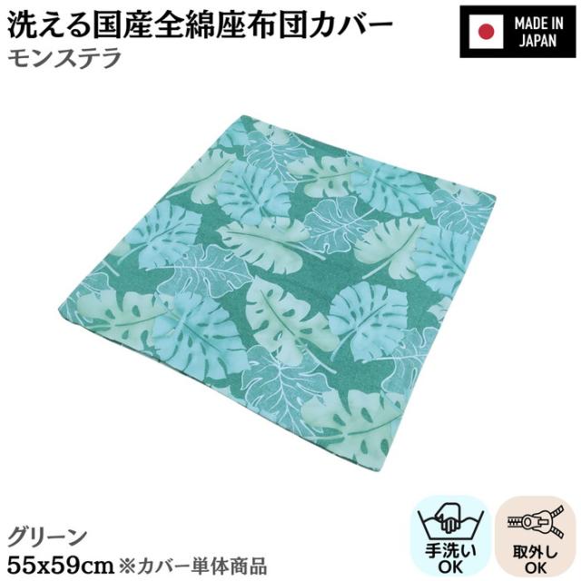 洗える国産全綿座布団カバー モンステラ グリーン 綿100% 日本製 ファスナー付き
